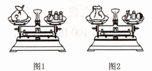 1. 如图1,天平呈平衡状态,其中左侧秤盘中有一袋玻璃球,右侧秤盘中也有一袋玻璃球,还有2个各20克的砝码。现将左侧袋中一颗玻璃球移至右侧秤盘,并拿走右侧秤盘的1个砝码后,天平仍呈平衡状态,如图2,则被移动的玻璃球的质量为(