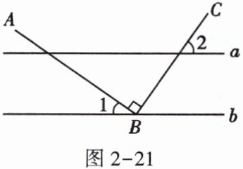9. 如图2-21,直线$a// b$,点B在直线b上,$AB⊥BC$。若$∠2=55^{\circ}$,则$∠1$的度数为。