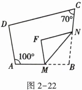 10. 如图2-22,四边形ABCD中,点M,N分别在AB,BC上,将$△BMN$沿MN翻折,得到$△FMN$。若$MF// AD$,$FN// DC$,$∠A=100^{\circ}$,$∠C=70^{\circ}$,则$∠B$的度数为。