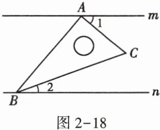 4. 已知直线$m// n$,将一块含$30^{\circ}$角的直角三角板ABC($∠ABC=30^{\circ}$)按如图2-18所示的方式放置,其中A,B两点分别落在直线m,n上。若$∠1=40^{\circ}$,则$∠2$的度数为()