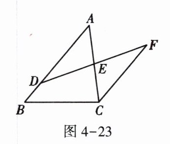 3. 如图4-23,$D$是$AB$上一点,$DF$交$AC$于点$E$,$DE = FE$,$FC// AB$。若$AB = 4$,$CF = 3$,则线段$BD$的长是________。