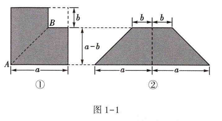 4. 如图1-1①,从边长为$a$的正方形纸片中剪去一个边长为$b$的小正方形,再沿着线段$AB$剪开,把剪成的两张纸拼成如图1-1②所示的等腰梯形。