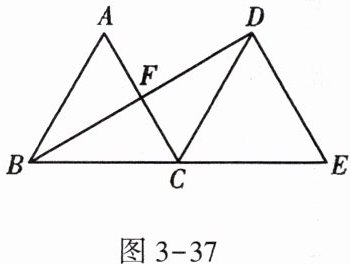 11. 如图3-37,△ABC是等边三角形,将△ABC沿直线BC向右平移,使B点与C点重合,得到△DCE,连接BD,交AC于F.猜想AC与BD的位置关系,并证明你的结论.