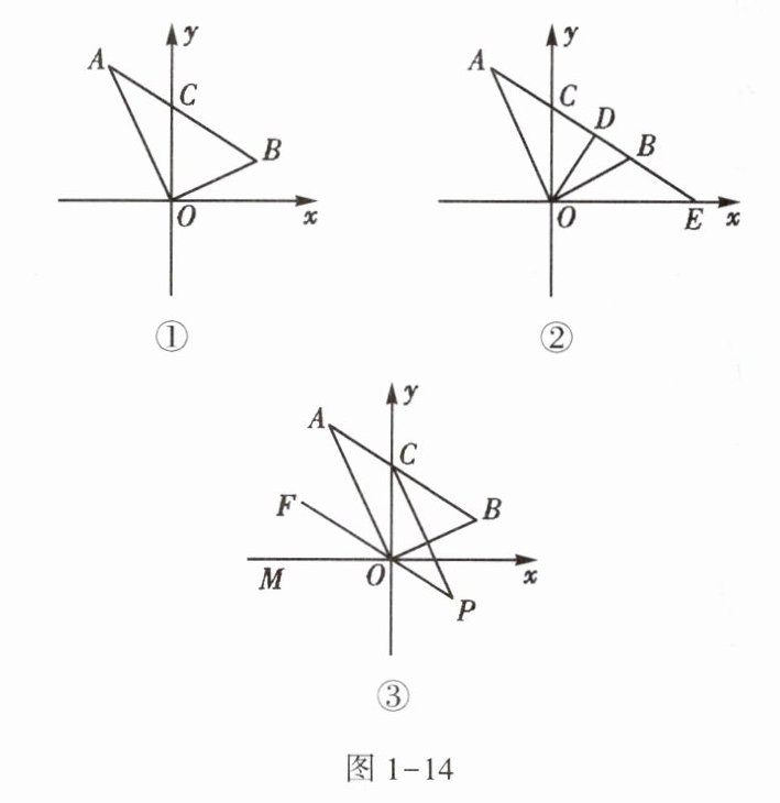 (3)如图1 - 14③,OF平分∠AOM,∠BCO的平分线交FO的延长线于点P,当△ABO绕O点旋转时(斜边AB与y轴正半轴始终相交于点C),在(2)的条件下,∠P的度数是否发生改变?若不变,请求其度数;若改变,请说明理由.
