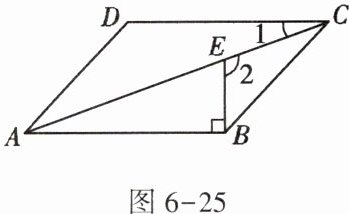 2. 如图6-25,在$\square ABCD$中,$BE \perp AB$交对角线AC于点E,若$\angle 1 = 20^{\circ}$,则$\angle 2$的度数为()