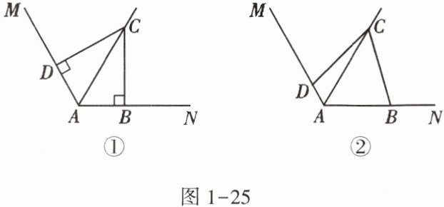(1)如图1 - 25①,若∠ABC = ∠ADC = 90°,请你探索线段AD,AB,AC之间的数量关系,并证明.