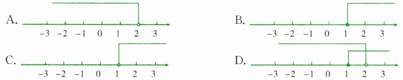2. (广东深圳最新中考题)一元一次不等式组 $ \left\{ \begin{array} { l } { x - 1 \geq 0, } \\ { x < 2 } \end{array} \right. $ 的解集在数轴上可表示为(