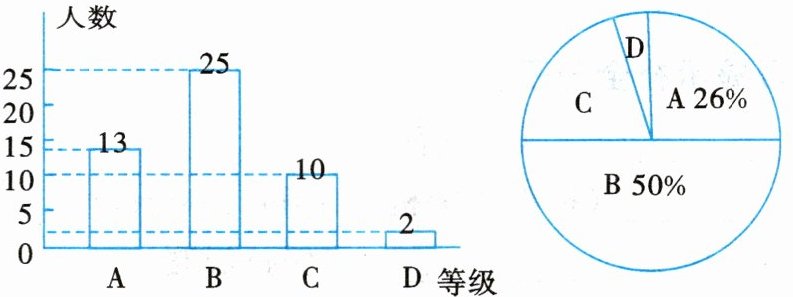 某校为了了解九年级学生体育测试成绩情况,以九(1)班学生的体育测试成绩为样本,按A,B,C,D四个等级进行统计,并将统计结果绘制成如下两幅统计图.请你结合图中所给信息解答下列问题: