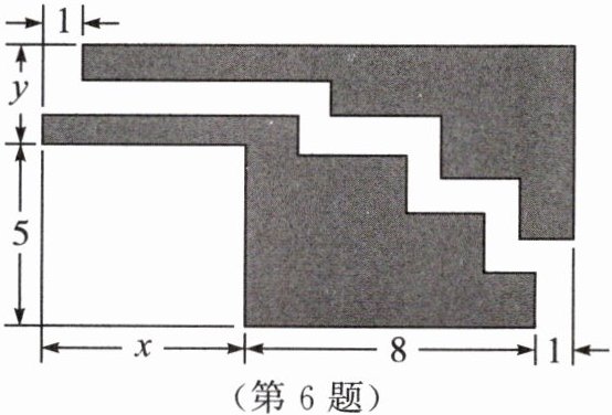6. 一片草地辟出一块长方形场地后,还修建了一条宽为1m的小道,如图(单位:m),根据图示信息,草地剩余部分(图中阴影部分)的面积可用含$x$,$y$的代数式表示为
