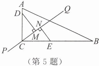 5. 如图,直线$PQ经过直角三角形ABC的直角顶点C$,$\triangle ABC的边上有两个动点D$,$E$,点$D以1cm/s的速度从点A$出发,沿$AC→CB移动到点B$,同时点$E以3cm/s的速度从点B$出发,沿$BC→CA移动到点A$,两动点中有一个点到达终点后另一个点继续移动到终点.过点$D$,$E分别作DM⊥PQ$,$EN⊥PQ$,垂足分别为$M$,$N$.若$AC = 6cm$,$BC = 8cm$,设运动时间为$t s$,则当$t= $