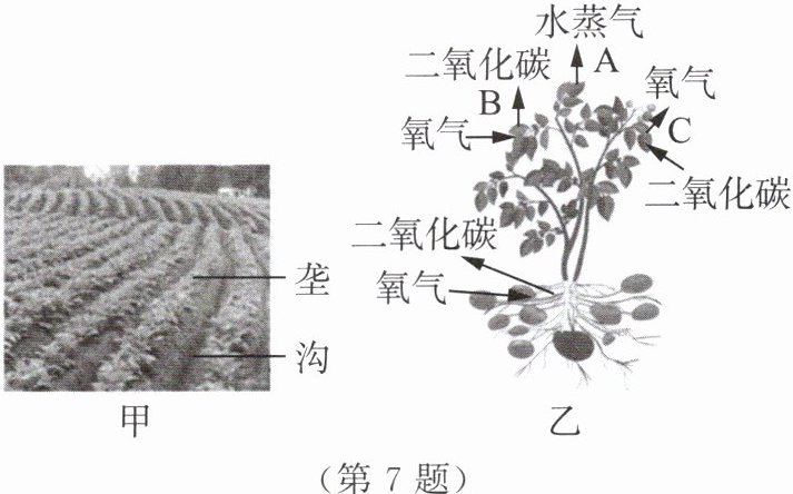 7. 垄沟种植是指在农田中挖沟起垄,并在垄上种植农作物的耕种方式,如图甲所示。研究结果表明,垄沟种植马铃薯能有效提高光合作用效率,增产30%左右。垄沟种植为什么能提高光合作用效率呢?下面让我们结合图乙进行分析(图乙中A、B、C表示植物体的三大生理活动)。