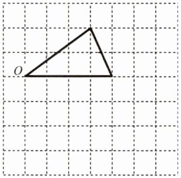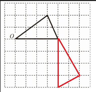 把下图中的三角形绕点$O$顺时针旋转$90^{\circ}$,再向右平移4格。