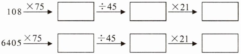 $108\xrightarrow{×75}\square\xrightarrow{÷45}\square\xrightarrow{×21}\square$