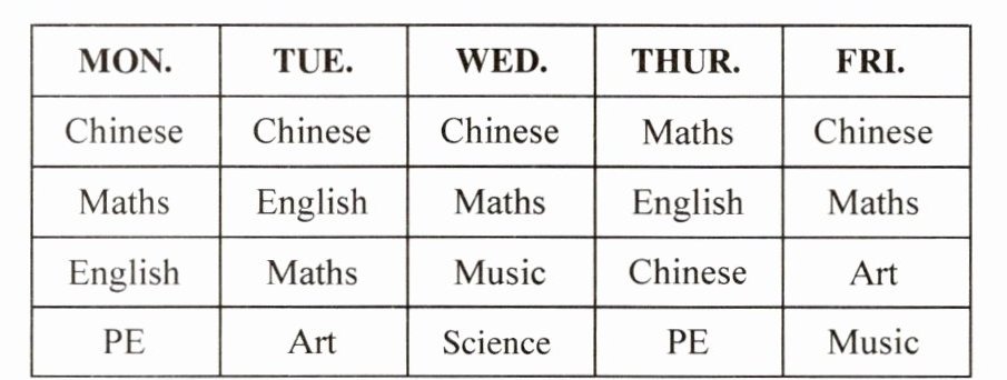 timetable; Chinese; Maths; English; Monday; Thursday; Music; Art; Science