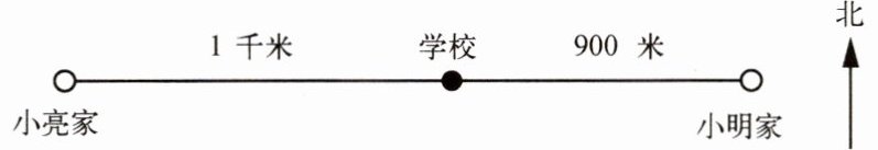 2. 小明家、小亮家分别在学校的东面和西面,到学校的距离如下图。星期天,小明从家里出发去小亮家,每分钟走65米,走了15分钟。这时,他的位置在学校的东面还是西面? 离学校有多少米?