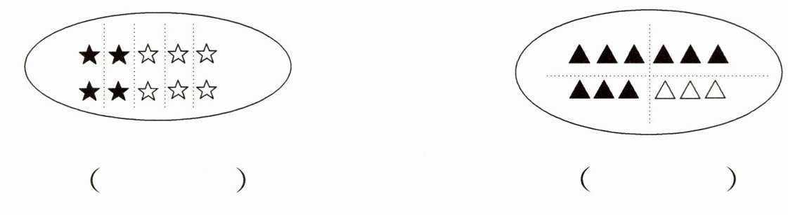 2. 小芳做幸运星,做了 6 个红色的,3 个蓝色的,还有 1 个绿色的。红色幸运星占总数的$\frac {()}{()}$,蓝色幸运星占总数的$\frac {()}{()}$,绿色幸运星占总数的$\frac {()}{()}$。