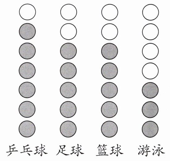 所以喜欢乒乓球的人最多,喜欢游泳的人最少。喜欢足球和篮球的人同样多。