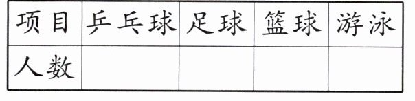 乒乓球:$6$人;足球:$5$人;篮球:$5$人;游泳:$3$人。