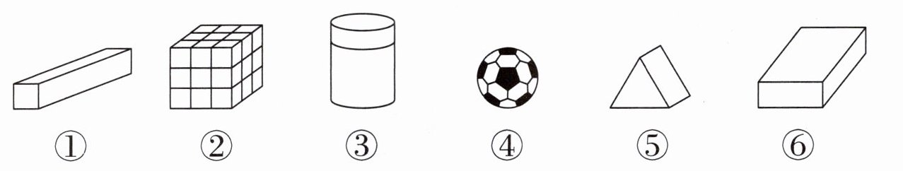 上面的物体中,所有的面都是正方形的物体是( );所有的面都是长方形的物体是( );只有两个面是正方形的物体是( );有两个面是圆的物体是( )。
