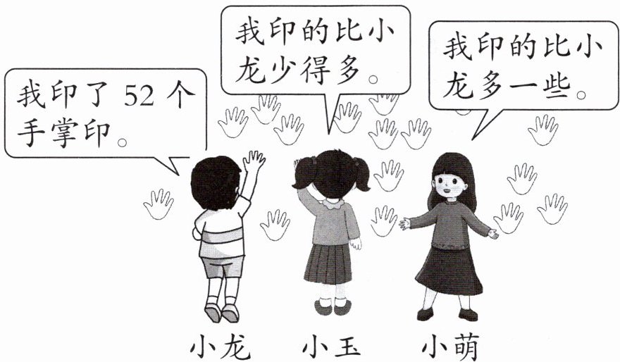 【解析】:“少得多”表示两者数量差距较大,“多一些”表示两者数量差距较小。小龙印了$52$个,$24$比$52$少得多,$55$比$52$多一些。
