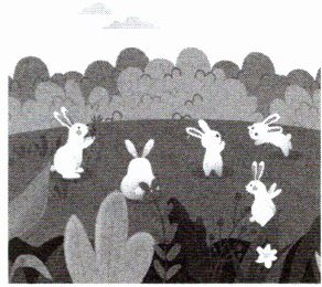 三、有8只小兔子在草地上玩耍,走了3只,又跑来了2只。根据图画展开想象,用几句话把这个过程写下来,并且算出现在草地上有几只小兔子,把算式写下来。