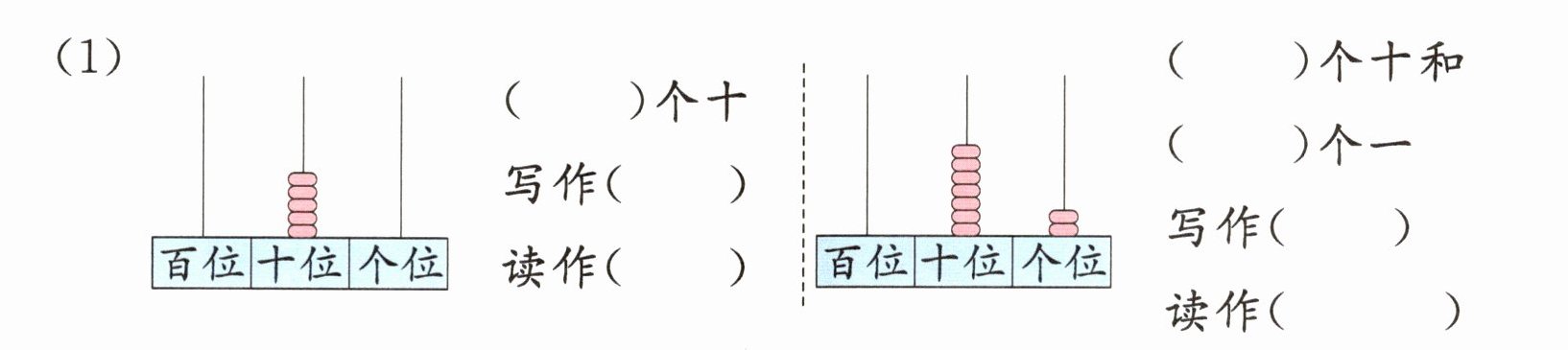 (5)明明上课积极发言,每天认真完成作业,已经获得了99颗小红星,再得1颗,就是()颗。请你在计数器上表示出这个数,它读作()。