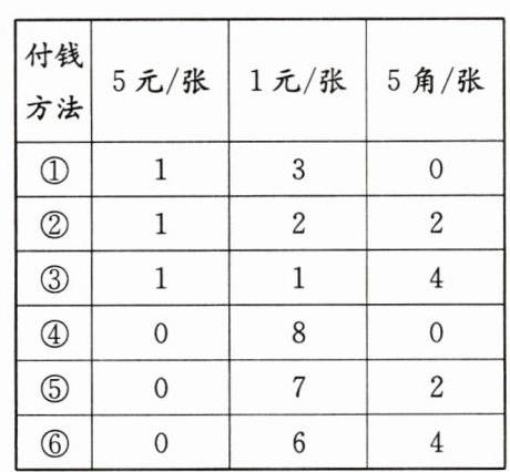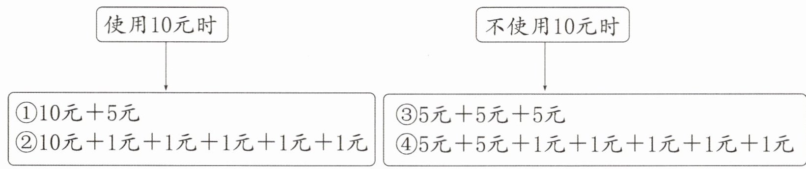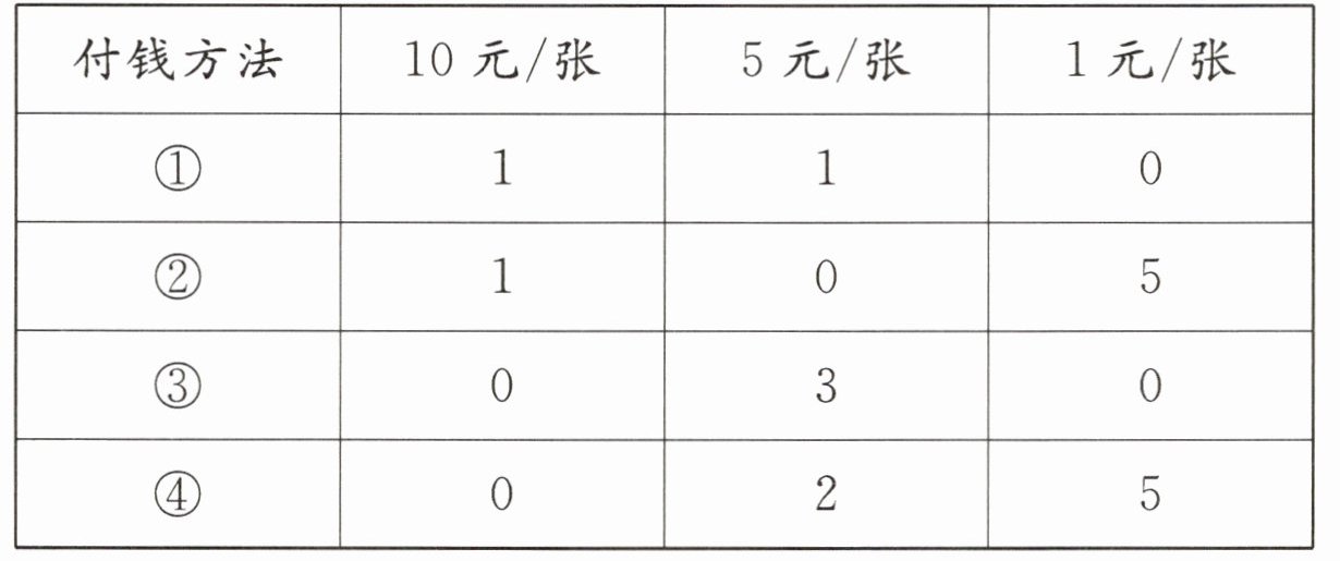 思路导引:当有多种付钱方法时,为了避免重复、遗漏,一般从大面值的人民币开始考虑,有顺序地进行组合。先考虑是否使用10元,然后看5元的用几张,再看1元的用几张。