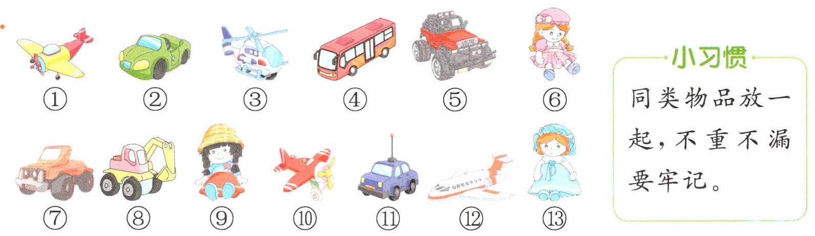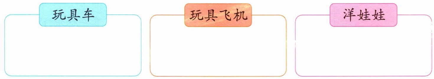 (2)玩具车的辆数是 6,玩具飞机的架数是 4,洋娃娃的个数是 3,$6>4>3$,玩具车最多,洋娃娃最少。