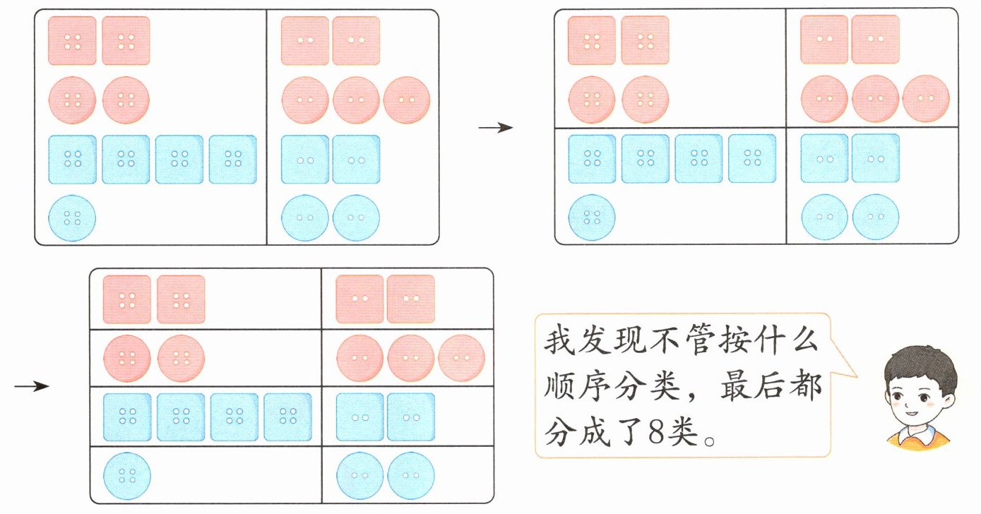 示例:先按扣眼的数量分,再按纽扣的颜色分,最后按纽扣的形状分。