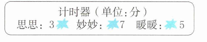 (3)思思、妙妙和暖暖比赛爬山时,计时器的屏幕坏了,只能看到一部分时间(如图)。已知三人平均用时43分钟,且每人的用时都没超过50分钟。思思用时()分钟,妙妙用时()分钟,暖暖用时()分钟。