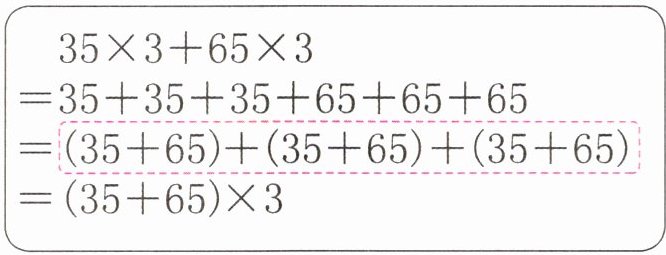 2. 聪聪在探究$35× 3+65× 3= (35+65)× 3$的算理时,想法如下图所示。虚线框内这一步运用的运算律是()。