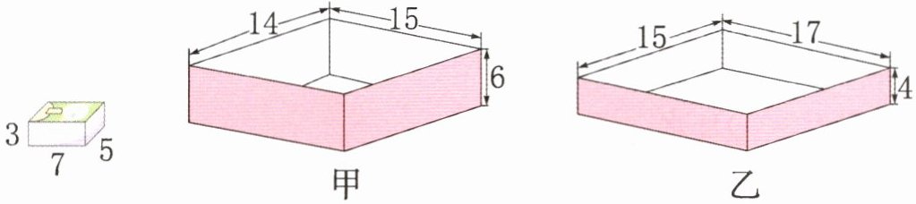 5. (北京·海淀)笑笑家有甲、乙两个不同规格的带盖收纳盒,她想把家里散落的小包纸巾分别放入这两个收纳盒中(纸巾不能超过收纳盒的上沿且不能挤压)。一小包纸巾的长、宽、高和甲、乙两个收纳盒的长、宽、高如下图所示(收纳盒制作材料的厚度忽略不计)。(单位:cm)