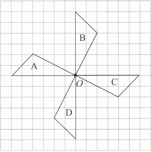 图形A绕点O顺时针旋转 $ 90^{\circ} $ 得到图形B;图形A绕点O顺时针旋转 $ 180^{\circ} $ 得到图形C;图形A绕点O逆时针旋转 $ 90^{\circ} $ 得到图形D。