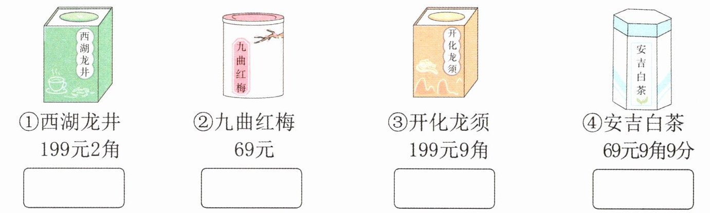 6. (易错题)给下面物品加上价签(以元为单位,用两位小数表示),并按照价格从低到高的顺序给它们排序(填序号)。(7★)
