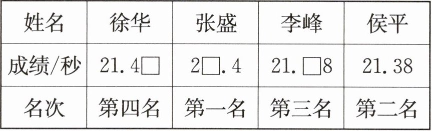 7. (培优题)下面是四年级 100 米跑前四名同学的成绩。徐华、张盛和李峰的成绩分别是多少?(9★)