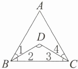 因为三角形 BCD 为等腰三角形,所以 $ \angle 2 = \angle 3 $。因为 $ \angle 1 = \angle 2 $, $ \angle 3 = \angle 4 $,所以 $ \angle 1 = \angle 2 = \angle 3 = \angle 4 $。