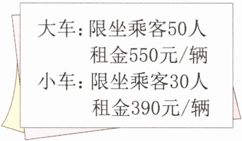 大车:$550÷50=11$(元/人) 小车:$390÷30=13$(元/人) $11<13$,所以应尽量多租大车且尽可能坐满。 $260÷50=5$(辆)……10(人) 租5辆大车,1辆小车:$550×5+390=3140$(元) 租4辆大车,2辆小车:$550×4+390×2=2980$(元) $3140>2980$ 答:租4辆大车和2辆小车最省钱;最少需要2980元。