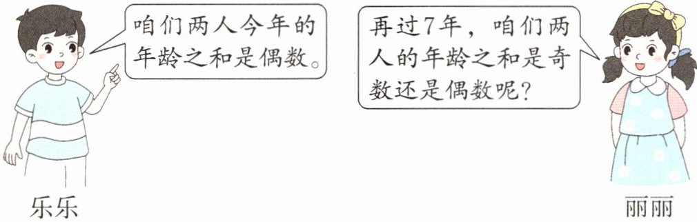 乐乐和丽丽今年的年龄之和是偶数,再过7年,乐乐增加7岁,丽丽也增加7岁,两人的年龄之和增加2个7岁,即14岁。根据“偶数+偶数=偶数”可知,再过7年,两人的年龄之和还是偶数。