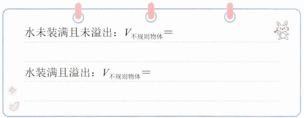 水未装满且未溢出:$V_{不规则物体}=容器底面积×水面升高的高度$