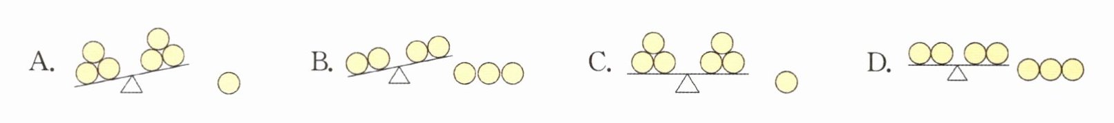 5. 乐乐买了7盒水彩颜料,其中6盒质量相同,另外1盒较轻。如果用天平称,下面表示称一次就刚好找出那盒较轻的水彩颜料的是()。(表示1盒水彩颜料)