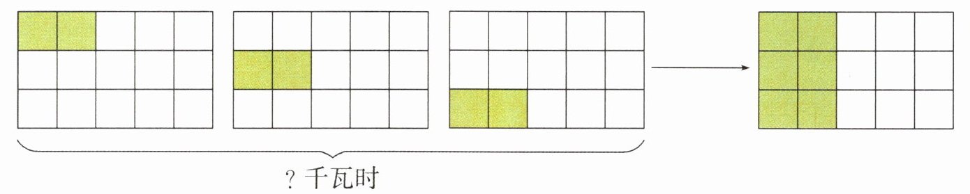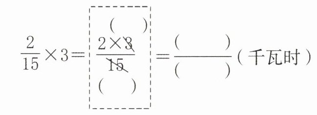 把 1 千瓦时看作单位“1”,用大长方形来表示 1 千瓦时。如图,把大长方形平均分成 15 份,其中的 2 份表示平均每天可节约的电。求 3 天可节约多少千瓦时电,就是求 3 个$ \frac { 2 } { 1 5 } $是多少。