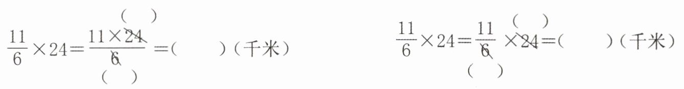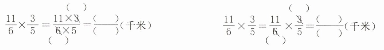 算法一$:$先计算结果$,$再约分。$ \frac { 1 1 } { 6 } × \frac { 3 } { 5 } = \frac { ( ) } { ( ) } = \frac { ( ) } { ( ) } ($千米$)$