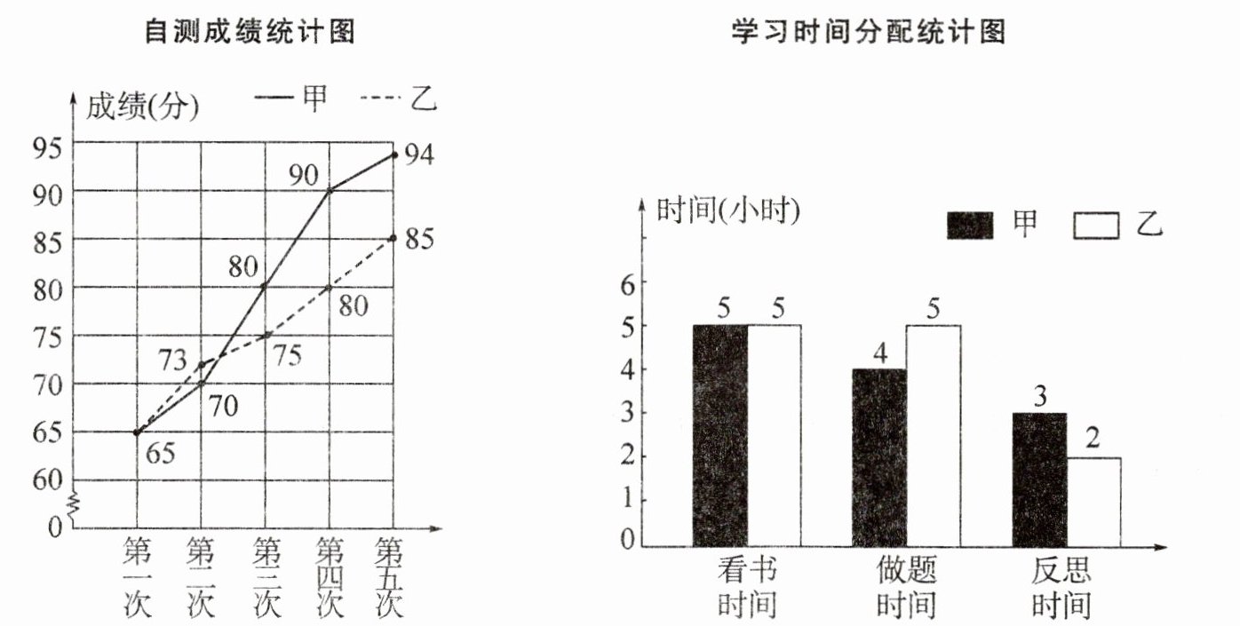 4. 下面两个统计图反映的是甲、乙两位同学期末复习阶段数学自测成绩和在家学习时间的分配情况。