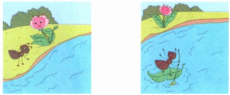 思路点拨:这次写话已经给出了开头,所以要按照这个思路往下写。题目中有两幅图,第一幅图是河边有一朵美丽的花,还有一只小蚂蚁,小蚂蚁想要过河。我们可以想象,小蚂蚁没办法过河,所以它肯定会向花姐姐求助。第二幅图,小蚂蚁已经在河中,它乘坐着一艘小小的船,原来是花姐姐的叶子。我们用自己的语言,把看到的内容连成一段通顺的话。在这个基础上,我们还要想象出小蚂蚁和花姐姐之间的对话,以及故事的结局。
