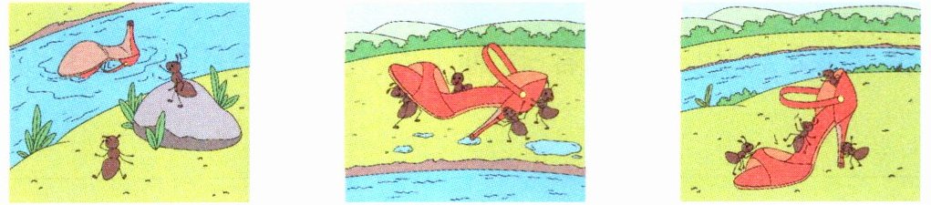 思路点拨:第一张图片是两只小蚂蚁在一条小河边玩,它们看到河里有一只高跟鞋。第二张图片上出现了好几只小蚂蚁,它们一起抬着那只高跟鞋。第三张图片上,是这些小蚂蚁在高跟鞋上玩滑滑梯的游戏。我们展开想象,用通顺的话把三张图片的意思连贯起来表达就是一篇小短文了。
