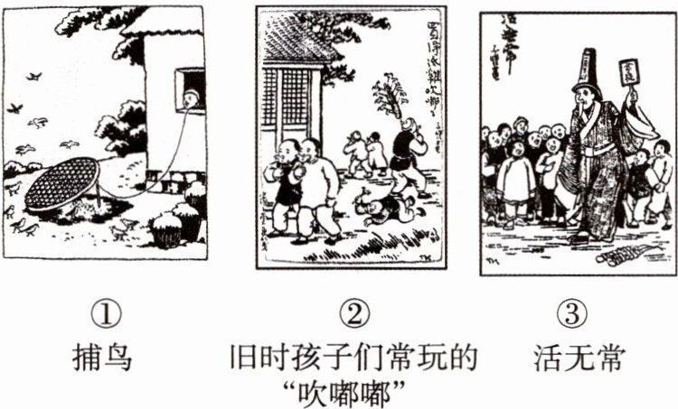 4. (1)下面是丰子恺先生为《朝花夕拾》画的三幅插图。根据画意和文字提示,写出相关文章的篇名。