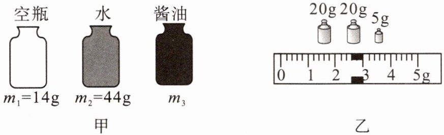 15. 小刚同学想测酱油的密度,但家里只有天平、小空瓶,而没有量筒。他思考后按照自己设计的实验步骤进行了测量,测量内容及顺序如图甲所示。