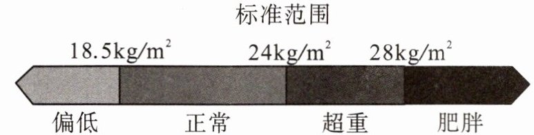 13. BMI是一个用于评估人体胖瘦和健康状态的简单指标。17岁的全红婵身高为1.5m,质量为39kg,利用公式$BMI= \frac{m}{h^{2}}$计算出全红婵的BMI数值(公式中质量以kg为单位,身高以m为单位)为______$kg/m^{2}$(保留1位小数),并对照如下标准(如图数据)判断她的BMI______(填“偏低”“正常”“超重”或“肥胖”)。如果小刚的BMI数值为$33kg/m^{2}$,那么为了保持健康的BMI值,你给他的建议是______。