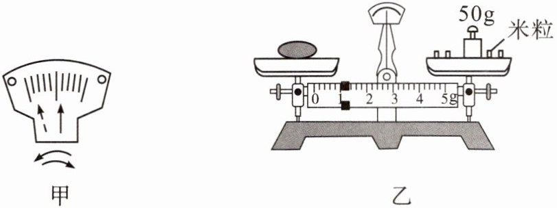 (2)小嘉发现无论怎样操作,天平指针总略偏向分度盘左侧。于是,他在天平右盘中放入几粒米,调节天平平衡后再进行测量。放入鸡蛋,调节天平再次平衡时,砝码和游码如图乙所示。此时,测出的鸡蛋质量为______g。