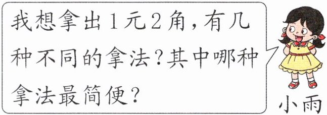 4种 拿1枚1元、枚1角的硬币最简便 解析:所有拿法如下表。拿 法 1元 5角 1角一 1枚 0枚 2枚二 0枚 2枚 2枚三 0枚 1枚 7枚四 0枚 0枚 12枚其中第一种拿法最简便。
